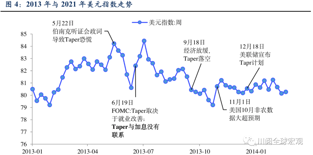 以史为鉴,2013年Taper“阴影”下美元为何表现“淡定”?2013年美联储Taper影响下,美元指数虽然波动较大,但整体中枢却是贬值的(上半年高于下半年)(图4)。可能存在三方面的原因: