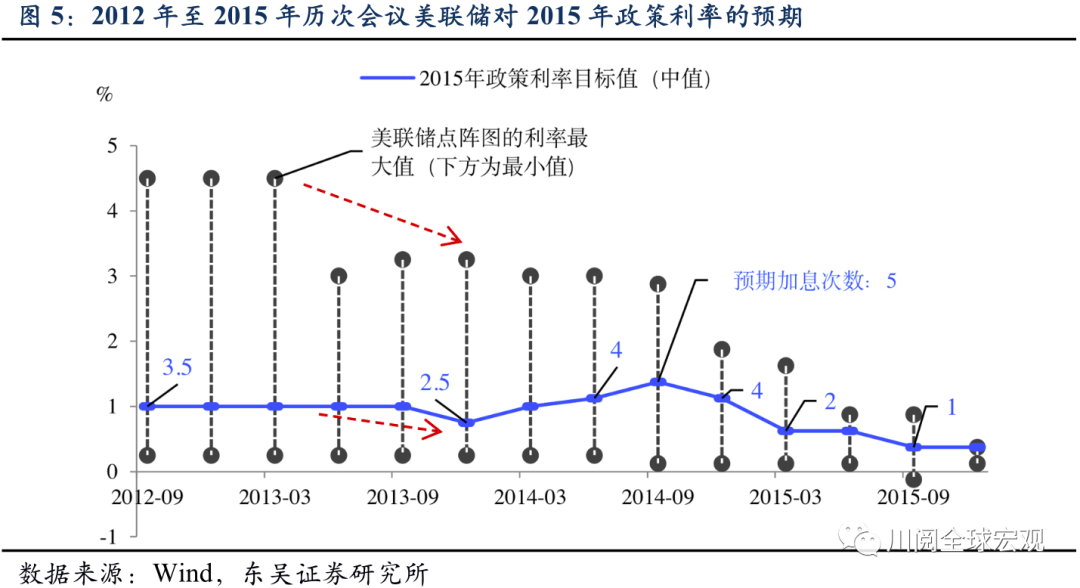 货币政策方面,除了Taper计划落地不顺利外,可能更重要的是美联储在利率预期上保持克制(表现为点阵图稳定偏鸽),2013年12月宣布Taper计划的同时下调了对2015年政策利率的预期中值(图5),这直接导致美元升值动力不足;