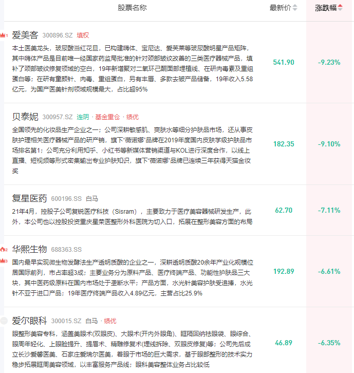 另外大跌的还有医美行业,板块跌幅超过2.5%,几只核心个股爱美克、贝泰妮双双跌超9%;而复星医药、华熙生物、爱尔眼科等权重股均大跌7%左右。