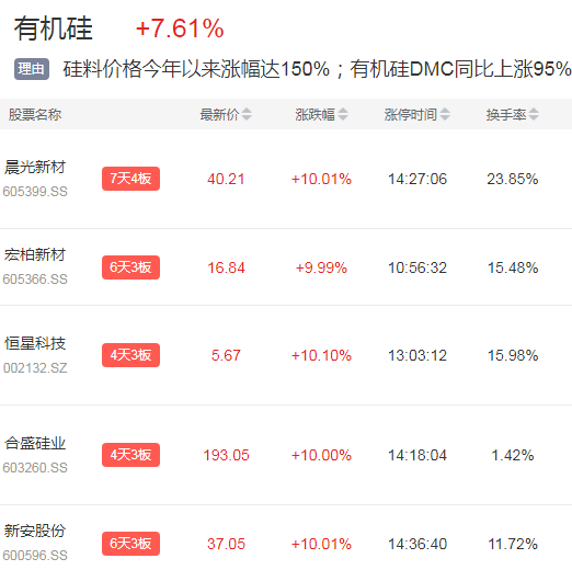 有机硅板块今日再掀涨停潮。晨光新材、合盛硅业、新安股份等多股涨停。