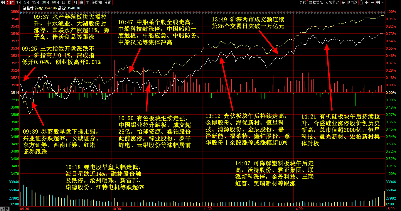 沪指全天维持震荡偏强走势,创业板指盘初一度跌逾1%,午后也拉升翻红。光伏板块持续发力,天合光能涨逾12%,股价创历史新高,清源股份、嘉泽新能等近20股涨停。有机硅板块持续拉升,合盛硅业涨停创新高,市值超2000亿,硅宝科技、东岳硅材涨超13%。两船重组进入实质性操作阶段,中船系个股集体拉升,中国船舶、中船科技双双涨停,此外有色金属、煤炭、水产养殖、白酒等板块走势活跃。个股总体涨多跌少,两市成交连续第26个交易日破万亿。
