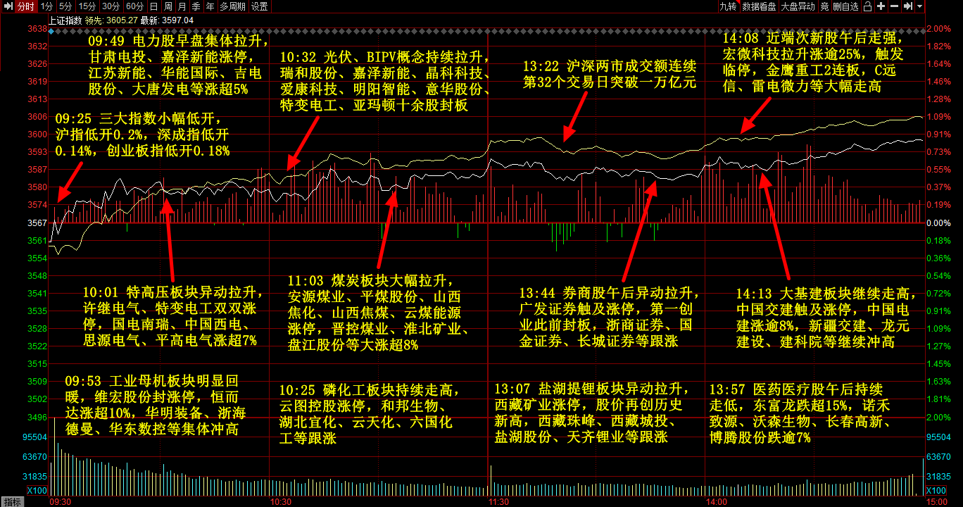 大小指数全天分化,煤炭、券商等权重板块拉升,沪指继续向上拓展反弹空间,创业板指则震荡走低,半导体芯片股走弱,北方华创盘中逼近跌停。光伏、风电板块掀涨停潮,汉嘉设计、森特股份、金风科技、明阳智能等50余股涨停或涨幅超10%。近端次新股午后走强,宏微科技触发临停,此外磷化工、大基建、钛白粉、有色金属等表现强势,个股涨多跌少,两市成交额1.4万亿,连续第32个交易日破万亿,但与昨天1.7万亿元相比缩量明显。