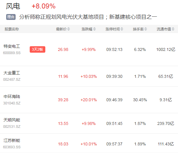 风电板块今日集体大涨,大金重工、天顺风能在内的数十只个股涨停。
