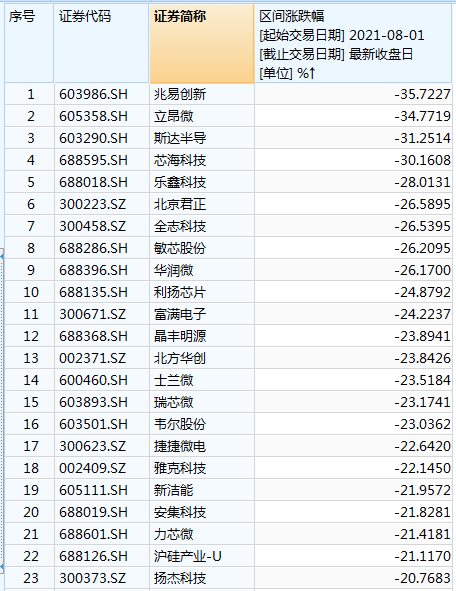 从8月初到现在,半导体板块整体回调幅度已经达到17%,有28只半导体个股跌超15%,23只回调超过20%,斯达半导、立昂微、兆易创新等跌超30%。
