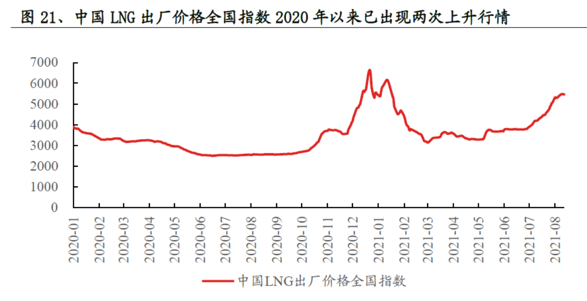 此外,液化天然气方面,9月6日上海石油天然气交易中心发布的中国LNG出厂价格指数为5922元/吨,最近四月涨幅高达79.89%;较3月3日低点的3152元上涨高达87.88%。