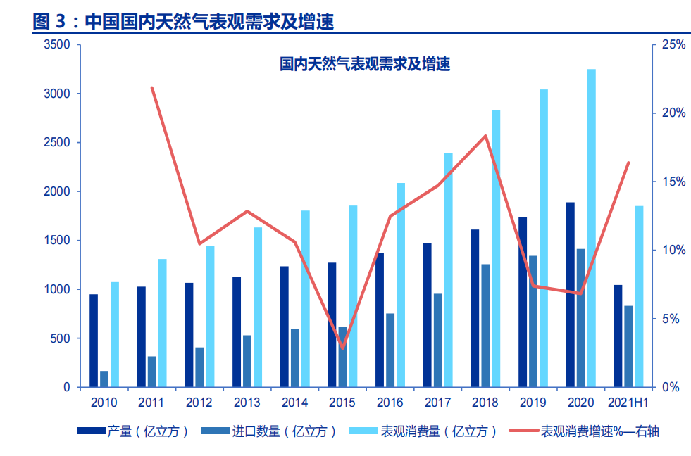 国内方面,官方公布数据显示,2021年上半年国内天然气产量1045亿立方米,同比增长10.9%,增速比上年同期加快0.6个百分点,两年平均增长10.6%;2021年上半年我国天然气表观需求1851亿立方米,同比增长16.4%;而在2019、2020两年的需求增速分别为7.4%、6.8%。