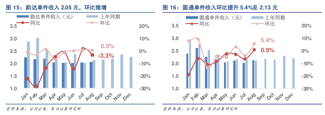 在监管政策加持、叠加派费上涨的背景下,8月份圆通单票价格实现同比正增长,是近3年来首次实现同比转正,此外,韵达、圆通、顺丰的单票价格也均实现了环比提升,国信证券认为释放出了短期价格有望出现拐点的积极信号。