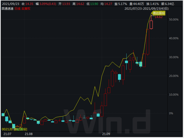 9月23日,圆通股价在前一日强势涨停的基础上,又再度大涨3%,从8月27日相对低点算起,公司股价已经大涨51%。