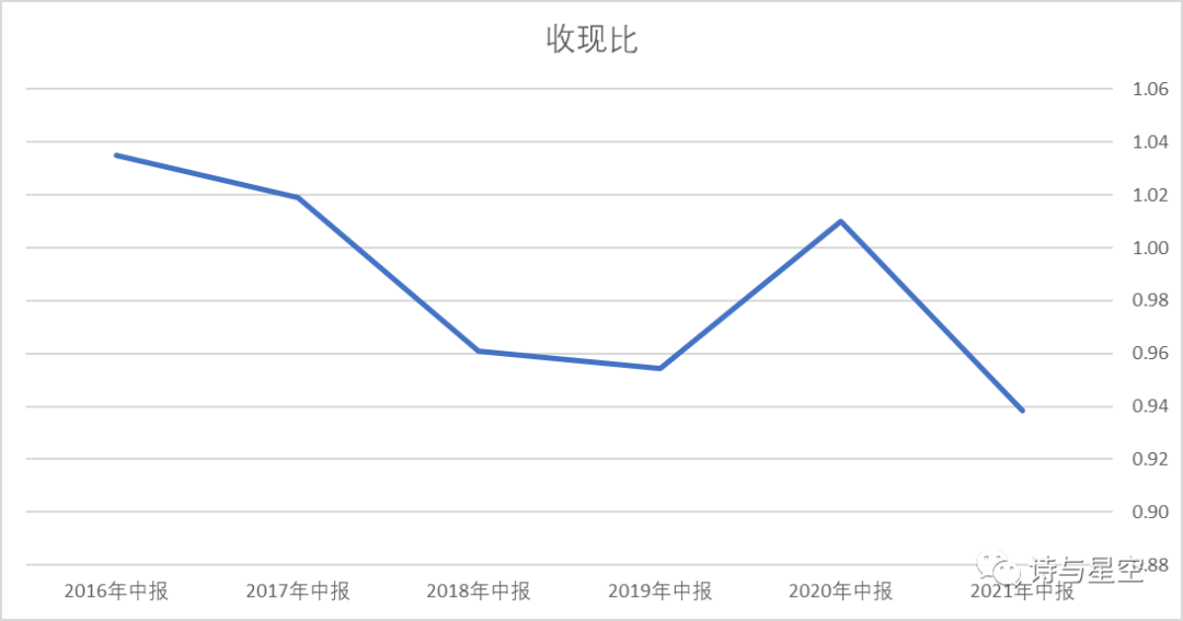 从近年来的中报,不难发现,海天味业在2017年之前,收现比是大于1的,但2018年、2019年和2021年却都小于1,除了2020年的特殊情况,收现比逐年都在下滑并在2021年半年报中下滑到最低点。