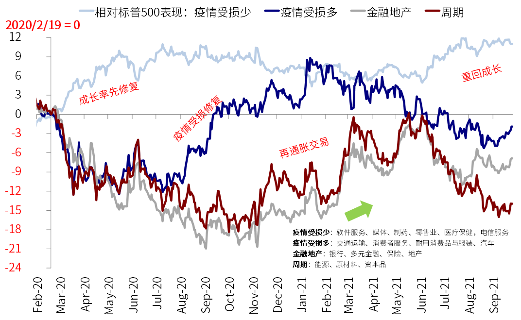 从风格层面,利率特别是实际利率的上行会阶段性的风格从成长到价值的再平衡,这一经验屡试不爽,近期美股的表现便是如此。但是由于当前的经济周期过了增长加速最快的阶段,我们认为从中期维度很难完全复制去年底今年初的再通胀交易,因此短期的再平衡后,当利率待QE减量开始和增长回落,可能会再度转向成长。