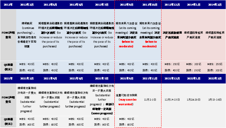 9月FOMC会议传递的各方面信号都是偏鹰派的(《9月FOMC:减量可能很快开启》),给出了强烈的信号减量不出意外的话可能会从11月会议(11月2~3月)开始。我们一再强调,从历史经验来看,长端美债利率往往是在预期阶段先行、而货币政策实际执行时反而筑顶回落。那么,如果11月初就开始执行的话,从现在开始预期修正的“正当时”,因此近期的表现也是符合2013年减量和此前多次加息附近利率变化的历史规律(《关于QE减量的八问八答 2021年8月16日~8月22日》)。