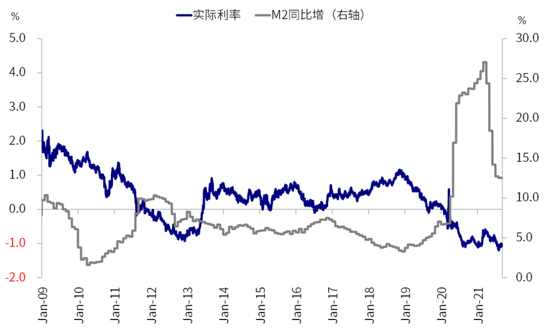 我们根据利率的五因子模型和对实际利率解释度较高的M2和储蓄率的历史关系,分别测算10年美债的均衡水平在1.8%附近,而实际利率可能隐含90~100bp的上行空间。