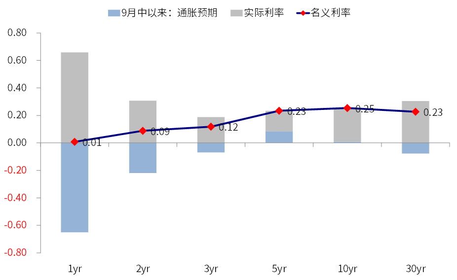 10年美债9月中旬以来~25个基点的上行中,实际利率贡献19bp,通胀预期贡献6bp。如果是相对8月初的低点,通胀预期更是基本持平不变,这也和我们在专题报告(《实际利率持续为负之“谜”》)中提示的一致。