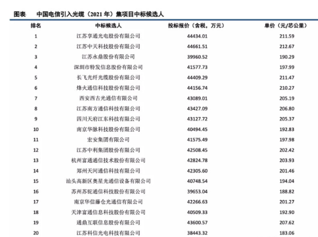 除开中国移动昨日的催化之外,近期中国电信也表示,已在上海-广州间建成国内首条全G.654E陆地干线光缆,全长1970公里,并且完成了引入光缆(2021年)集中采购项目的投标文件的评审,根据评审结果,亨通、中天等20家厂商入围