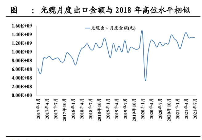 同样的观点还有国泰君安,从出口端数据分析来看,光缆上半年出口金额同比去年约增加20%,而光纤月度出口金额水平接近2018年历史高位水平。目前每个月出口额接近3亿元,且自18年之后,再次重现出口大于进口金额,有望指引国内行业景气程度。