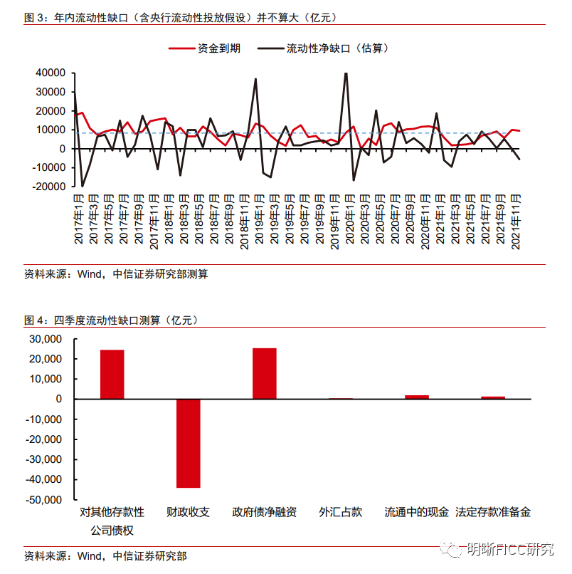 我们在《债市启明系列20210914—年内流动性缺口大吗?》中详细测算了四季度的流动性缺口情况:考虑财政支出提速和央行对冲操作,年内流动性缺口的确不是很大。如果考虑财政支出提速对冲政府债券发行、央行公开市场操作对冲资金到期,则年内除10月份流动性缺口大于5000亿元外,其他月份流动性缺口小,甚至可能出现流动性盈余。和历史水平相比,年内流动性缺口(含央行流动性投放假设)并不算大,也较上半年有所降低。按四季度整体测算,虽然政府债券发行会继续消耗流动性,但财政支出力度也将加大,综合来看政府存款变化将对流动性提供约19000亿元支持。四季度流动性最大的缺口是共计24500亿元的MLF到期,央行可通过等额续作或小幅超额续作方式予以对冲。