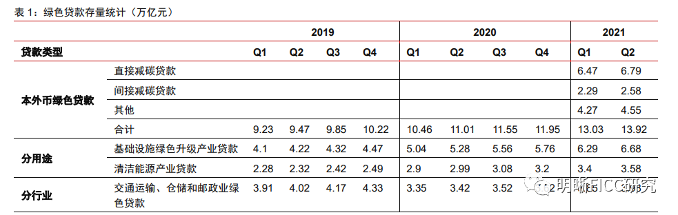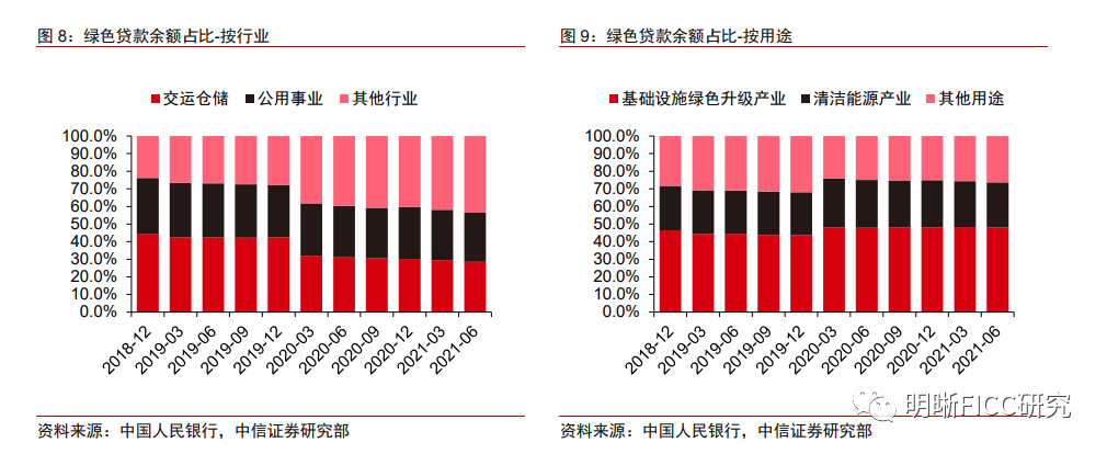绿色贷款惠及的行业逐渐多元化,但主要用途仍在于基础设施绿色升级。从绿色贷款的行业来看,2018年末,交通运输、仓储和邮政业的比重达到44.5%,电力、热力、燃气及水生产和供应业的比重则为31.7%,两者合计占绿色贷款余额比重的76.2%,集中度比较高,但随着绿色贷款业务的发展,更多行业也开始得到绿色信贷的支持,前述两个行业在2021年二季度末的比重分别降至28.6%和27.9%。虽然行业逐渐多元化,但是从用途来看,最核心的依然是基础设施绿色升级,其次是清洁能源产业,两项用途在2021年二季度末的占比分别为48.0%和25.7%。