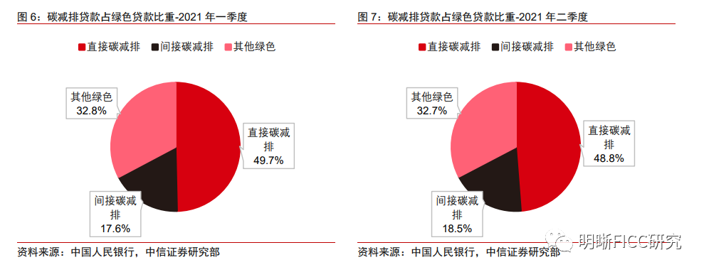 促进碳减排是绿色贷款的核心要义。截至2021年二季度末,13.92万亿元的绿色贷款余额中,投向具有直接和间接碳减排效益项目的贷款分别为6.79和2.58万亿元,与一季度末相比,碳减排用途的绿色贷款增加了6100亿元,环比增速7.0%,略高于绿色贷款整体的环比增速6.8%。从占比来看,碳减排贷款占绿色贷款的比重在上半年维持在2/3以上,促进碳减排毫无疑问是目前绿色贷款助力绿色转型的核心发力点,这与今年碳中和债为主的绿色债券市场有相似之处。