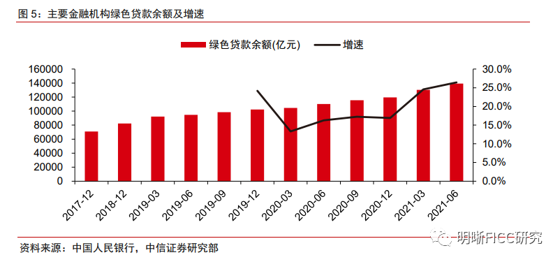主要金融机构绿色贷款增速持续提升,考核压力下预计高增势头仍将延续。根据央行发布的《2021年二季度金融机构贷款投向统计报告》,截至2021年二季度末,本外币绿色贷款余额为13.92万亿元,同比增长26.5%,比一季度末高1.9pcts,高于各项贷款增速14.6pcts,上半年绿色贷款余额共增加1.87万亿元。实际上从最近4年的数据来看,主要金融机构绿色贷款余额增速始终不低,基本保持在15%以上。绿色贷款持续高增,最核心的原因在于银行面临的绿色考核,无论是之前的绿色信贷考核,还是现在的绿色金融评价,都对绿色贷款的比重、增速等提出了定量的打分依据,且预计考核达标难度会日益提升,由此进一步促进银行体系支持绿色转型。