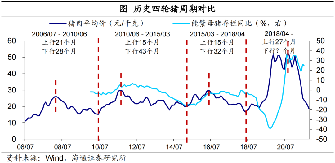 所以我们可以看到,从母猪补栏到猪价回落,这一轮猪周期同样遵循以往的运行规律。不过对比来看,本轮周期也有明显不一样的地方。在本轮猪价上行周期中,从猪价的反弹幅度看,本次周期中猪价的高点(超过50元/千克)要显著地超过前几轮(不超过30元/千克)。从周期的时间看,猪价从上行开始到触顶回落,维持了27个月,要明显长于前三轮平均17个月的水平。