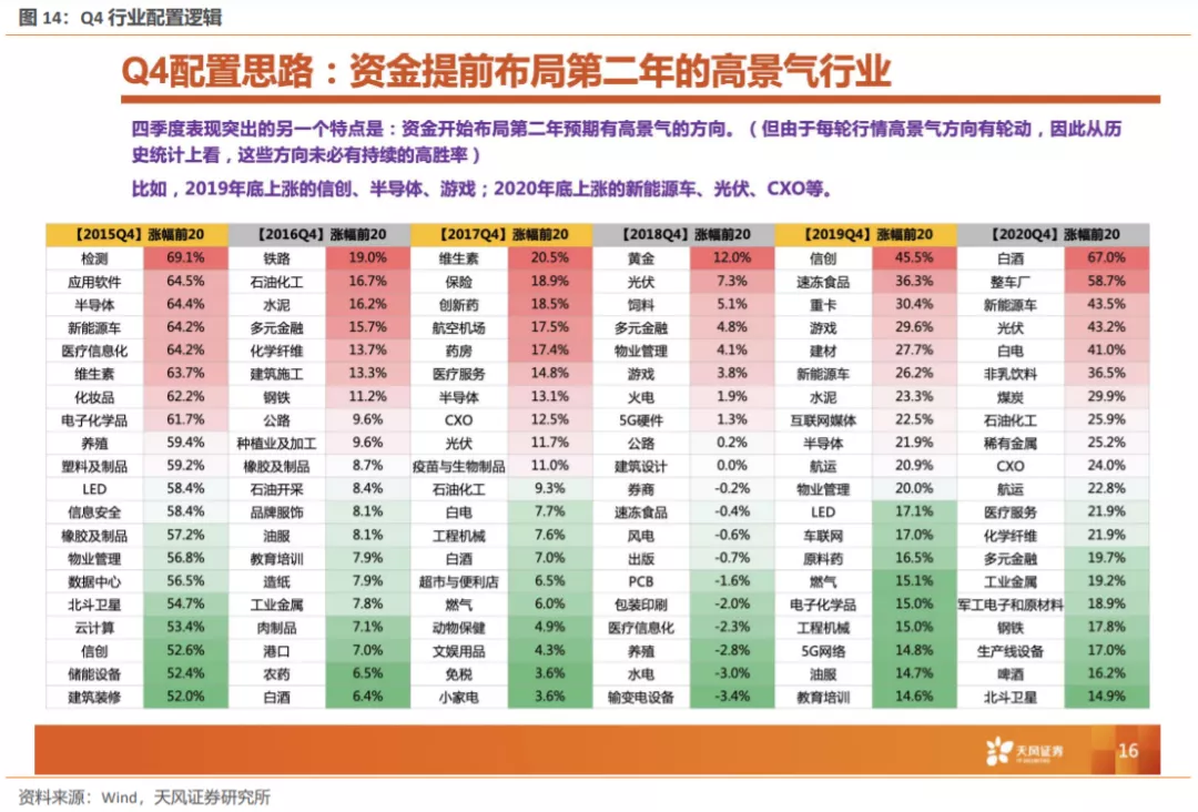 不论18年Q4摩擦恶化、去杠杆余温尚存的悲观环境、19年Q4库存周期带动经济回升预期的乐观环境、还是20年永煤导致央行扩张的放水环境,大家都会寻找一些预计转年结构性高景气的方向提前布局。