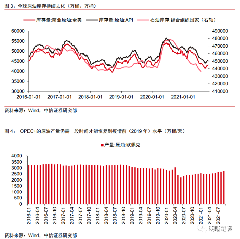 供不应求局面下,全球原油库存已处近年来低位,OPEC+仍维持原定增产计划,后续重点关注11月4日的OPEC+会议。当前全球原油库存也处于近年来的低位。7月以来美国商业原油库存降至45000万桶以下,OECD国家的原油库存也从2020年7月后持续下行。当前OPEC+会议决定维持原有40万桶/日的增产计划,其9月的原油产量为2732.8万桶/天,仍需一段时间才能恢复到疫情前(2019年月均产量2985.3万桶/天)水平。此外,天然气和煤炭等其他能源的紧缺问题,也在一定程度上引发连带效应,为石油价格形成支撑。综上来看原油的供不应求局面短期内难以改变,原油期货价格也在10月后稳居80美元/桶以上。