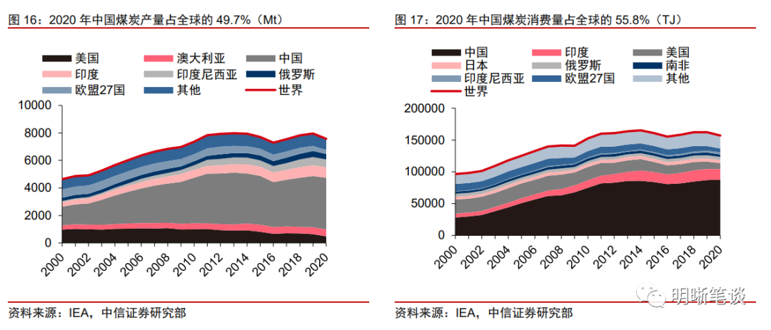 中国是全球主要的煤炭生产国和消费国,后续的供需缺口测算将以中国为例。以2020年全球的煤炭消费和生产情况为例:煤炭生产中,中国生产3764.4Mt,占全球总产量的49.7%;煤炭消费中,中国消费约87638TJ,占全球总消费量的55.8%。鉴于中国在全球供需两端的影响较大以及数据的可获得性,后续煤炭缺口的分析将聚焦于中国。