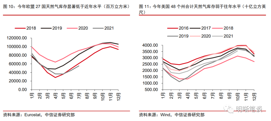 当前欧美等地天然气库存显著低于往年水平,随着用气高峰来临,后续库存去化或加剧供需矛盾。与原油不同,全球天然气消费呈现出明显季节性,冬季为用气高峰。受此影响,天然气的补库阶段往往在4月-11月,去库阶段则为12月-3月。当前虽然欧盟和美国的天然气正在持续补库,但从库存的绝对水平看其显著低于往年水平。考虑到今年冬季为冷冬,用气需求将高于往常,因此库存去化或有所提速,或导致天然气库存新低,加剧天然气供需矛盾。