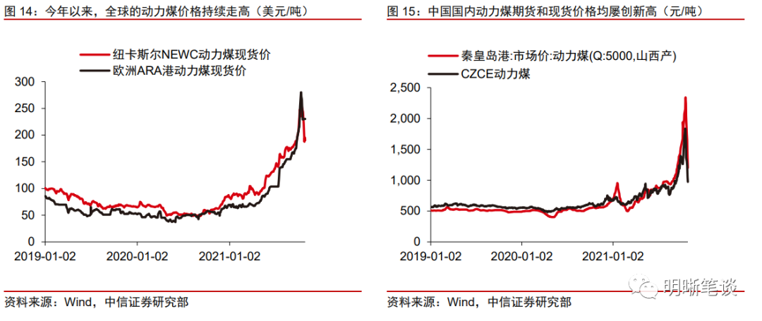 2021年动力煤价格爆发式上涨,近期中国政策层的发声使得煤价快速降温。全球视角下,纽卡斯尔动力煤和欧洲ARA港动力煤的现货价格在今年持续走高,二者的价格高点分别达到253.55美元/吨和280美元/吨。中国方面,今年以来国内用电量高增,但煤炭供给在环保限产等因素影响下弱于需求,受此影响动力煤期货和现货价格均屡创新高,期货价格高点(1835.6元/吨)较年初上涨 173.4%,现货价格(秦皇岛港:市场价:动力煤Q:5000,山西产)站上2000元/吨,其年内高点(2342.5元/吨)较年初上涨231.1%。高煤价导致国内发电成本急剧攀升,加剧企业成本压力,这也引发了近期政策层的多次发声。近日,国家发展改革委及多部门相应发声以遏制煤炭价格非理性上涨,显示了政策层面保供稳价的决心,受此影响,煤炭期市开始大幅回调。