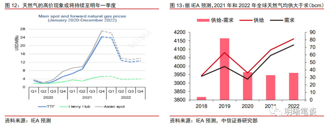 预计天然气的高价或将在短期内持续,后续供给的改善以及季节性高峰的结束将推动天然气价格在冬季后回落。据IEA预测,2021年和2022年全球天然气均供大于求,其中2021年天然气供给超需求约330亿立方米,预计2022年供给超需求约360亿立方米。由于天然气供应系统对于天气变化较为敏感,因此当前区域性和阶段性的供需矛盾或难以避免。预计未来天然气需求维持缓慢增长,主要需求增量来自以中印为代表的亚洲新兴市场,供给方面主要来自俄罗斯和中东在建天然气项目的潜在增产。据IEA预测,天然气的高价或将持续整个冬季,后续供给的改善以及季节性高峰的结束或将推动冬季后天然气价格回落。
