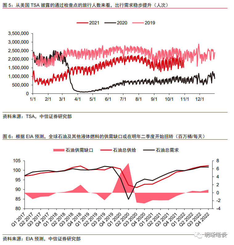 随着需求逐步增加,供给持续修复,预计石油供需缺口将在明年二季度开始扭转。根据EIA统计,今年前三季度石油及其液体燃料均处在供不应求的状态,直至四季度仍存在约83万桶/天的缺口,我们预计当前石油的供需缺口将在明年二季度开始扭转。从需求端来看,今年冬季预期较为寒冷,在能源危机下,石油或作为天然气等能源产品的替代品来弥补需求缺口。从美国TSA披露的通过检查点的旅行人数来看,出行需求稳步提升,10月以来的数据已经接近2019年水平。从供给端来看,石油供给将在明年二季度显著增加,逐步修复当下的供需缺口。潜在的供给增量主要来自非OPEC国家,预计加拿大、中国、俄罗斯、挪威、巴西等国家都将缓步增产,此外伊朗方面若恢复原油供应则可能加速全球原油供需缺口的修复。