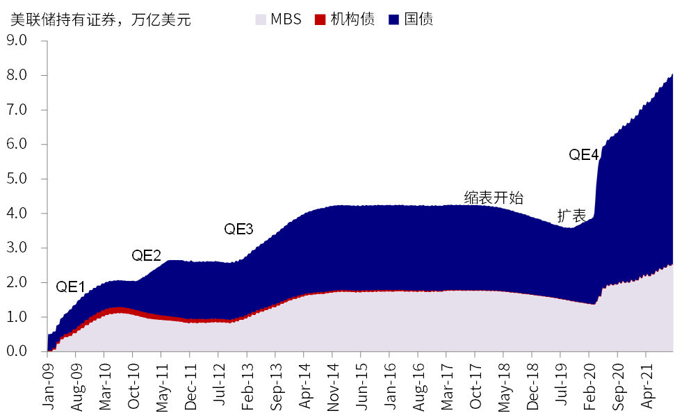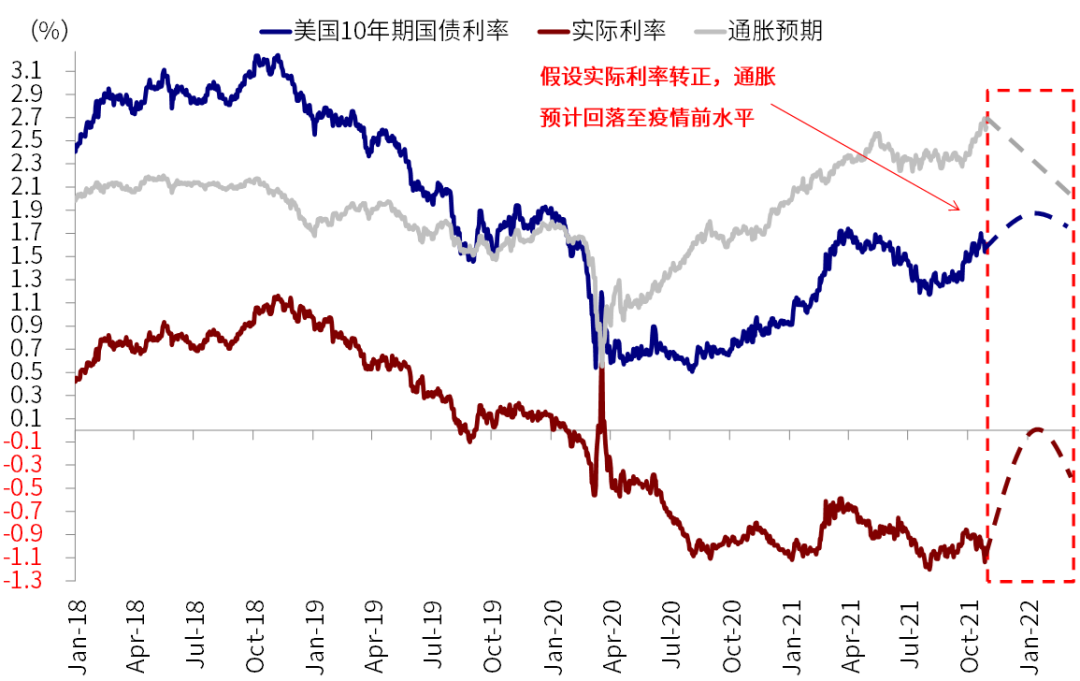 减量的正式开启,对于未来美股和美债的影响可能并不完全相同。从债券角度而言,我们认为长端国债可能仍有一定上行空间以反映美联储减量在流动性退出、特别是因为持有规模过大导致定价扭曲的实际利率上的补偿,因此仍以实际利率为主,我们预计的均衡水平依然在1.8%附近。
