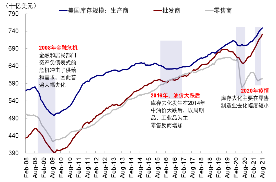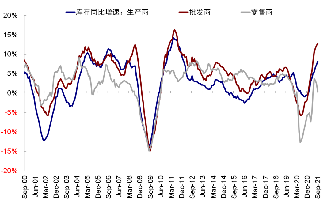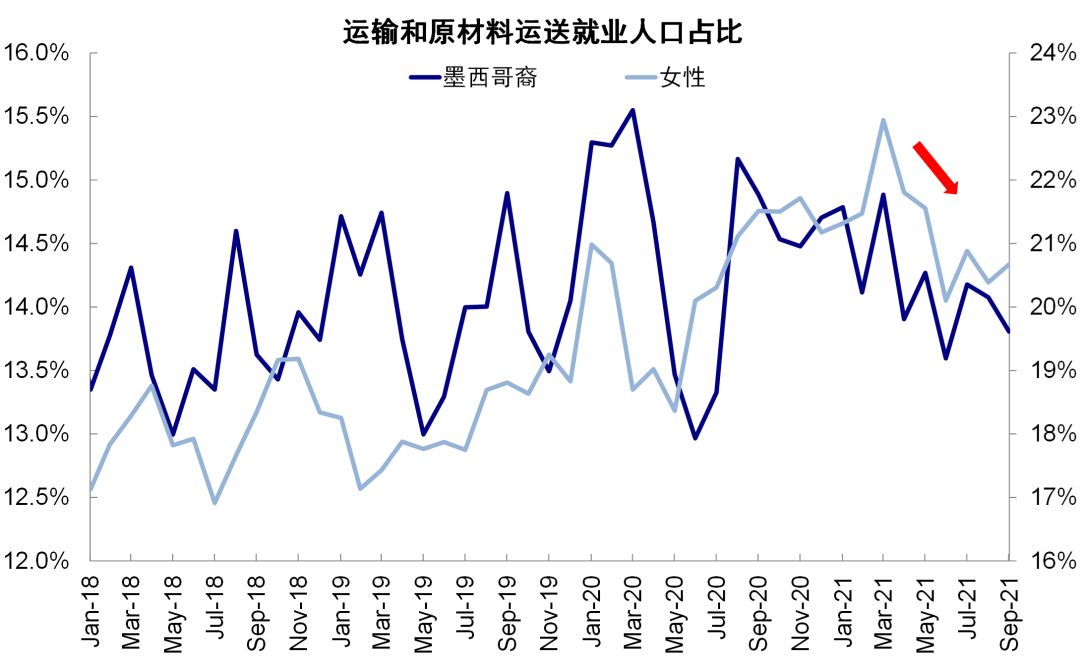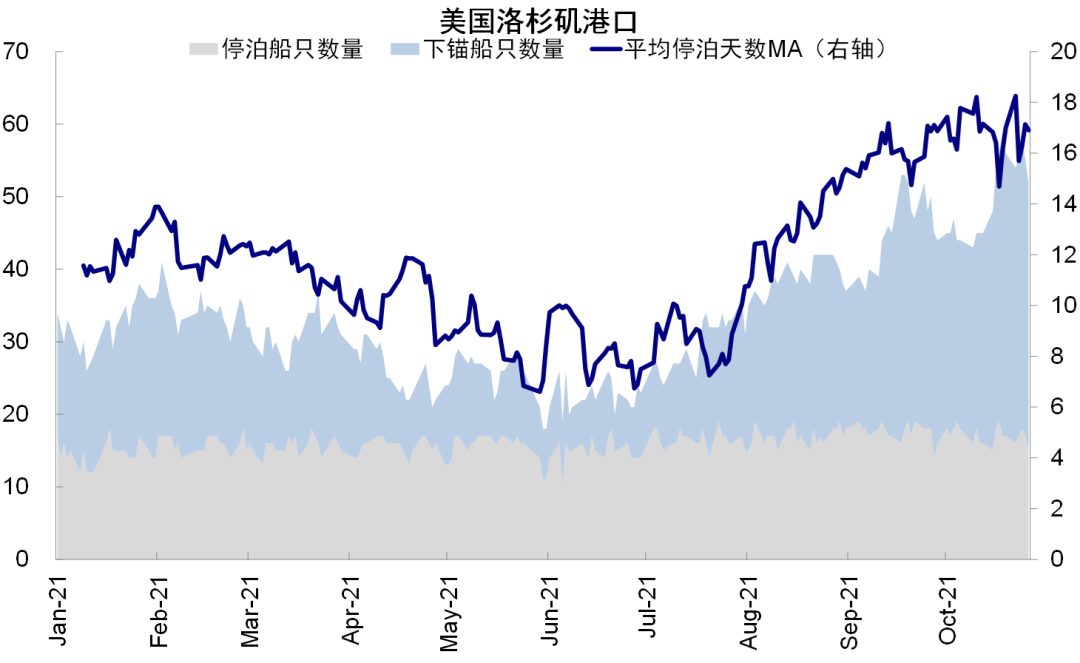 这一点与我们此前的发现基本类似,即近期造成价格压力的供应矛盾更多在运输和渠道环节,而非更加棘手难以解决的产能上,主要体现为渠道环节(港口码头、卡车司机等等)的拥堵、以及批发商相比终端更高且更快增长的库存水平、相比之下,产能利用率特别是原材料缓解的产能利用率却普遍偏低。那么往前看,随着当前疫情持续改善,以及边境开放可能带来的更多墨西哥籍人工的增加,不排除缓解一部分运输环节压力,而运输缓解的减轻(当然需要时间)、叠加已经边际回落的需求和不低的渠道库存,可能在某个时间使得终端库存超过需求水平,进而带来价格的均值回归。因此,我们有理由认为,当前因为供给瓶颈所导致的价格压力是有改善空间的,至少不是往继续恶化的方向发展。实际上,美国洛杉矶港口的停泊数从10月初以来高点已经不再增加、10月ADP就业也在改善,都表明剔除掉Delta疫情夏天升级这一因素进行控制变量分析后,可能会提供更清楚的图景,类似于本轮疫情升级前就业市场的修复和价格压力的缓解。