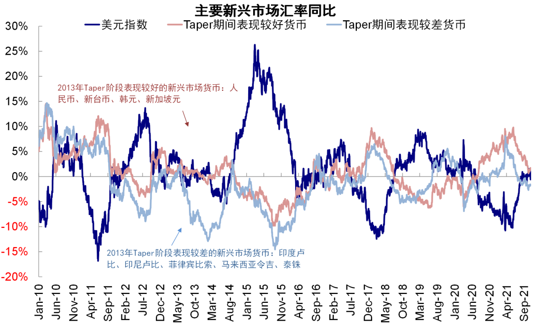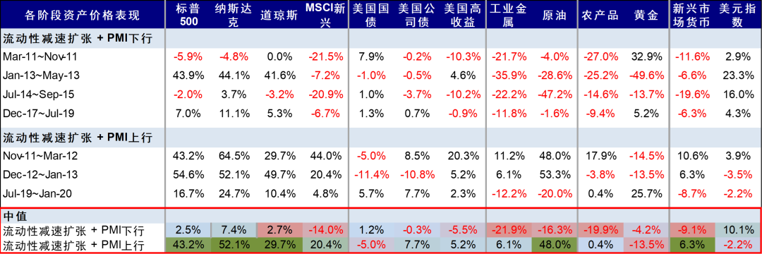 不过从历史经验来看,我们注意到单纯的流动性拐点并不能很好的刻画资产表现决定变量,因此需要叠加增长环境。如果流动性拐点出现时,新兴市场表现依然较好、那么可以低于外部的压力,资金流出压力较小,同时新兴市场表现要更好,美元、国债和黄金明显落后。反之,如果全球增长回落特别是新兴市场面临与发达市场越发扩大的增长落差,那么流动性拐点会方法这一压力。此时美国资产的相对比较优势,新兴市场和大宗商品等增长型和风险偏好资产落后,因此可能伴随着资金回流美国并支撑美元指数。