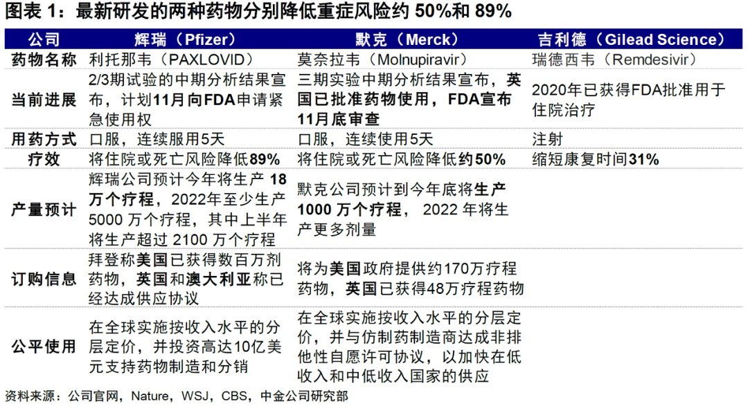 不同于2020年已经用于临床的瑞德西韦(Remdesivir),最新两种药物为口服给药方式,患者无需住院治疗,可自行在家根据处方服药。当前两公司均计划在11月进行FDA审批,其中默克已经拿到英国的限制性使用授权,并已与美国、英国和澳大利亚等签订购买协议。