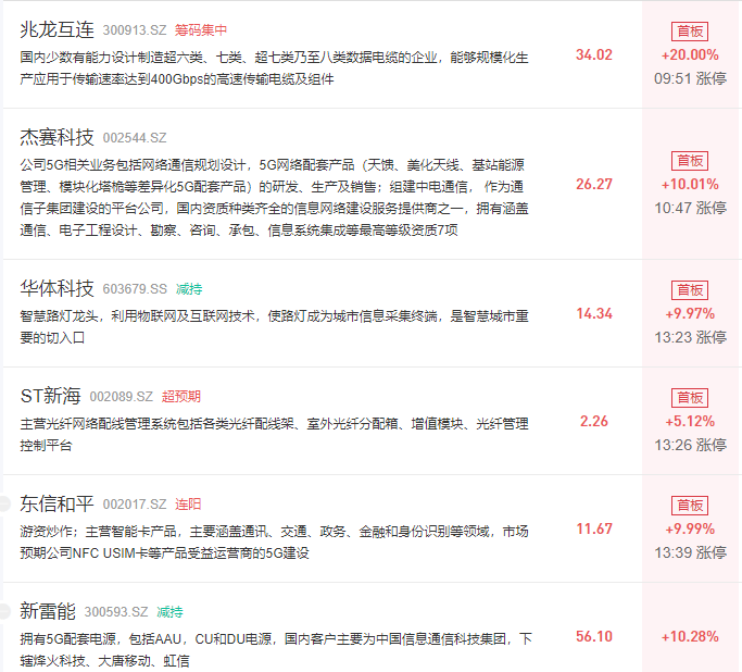 沉寂多日的5G板块今日多股异动,华体科技、东信和平、杰赛科技先后涨停,另外5G消息概念彩讯股份、梦网科技等涨超5%。