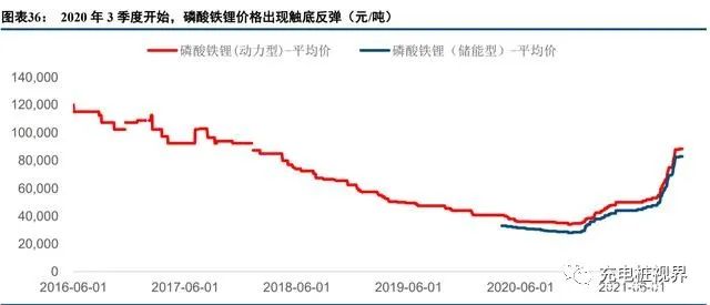 随着中国新能源补贴爬坡,磷酸铁锂凭借性价比和安全稳定性重新得到重视,动力型和储能型磷酸铁锂截 止 2021 年 11 月均价分别为 5.4 万元和 4.9 万元,较 2020 年均价分别上涨 46%和 56%。年初以来涨幅分别为 133%和 152%,这主要是由于:1)新能源汽车从政策需求导向转向市场需求导向,磷酸铁锂作为性价比较高的正极 材料在这个过渡时期再次得以重用:2)随着需求普及,电动车渗透率不断超预期,行业贝塔属性带动产业链景 气持续。