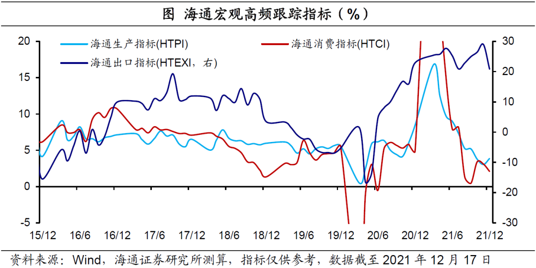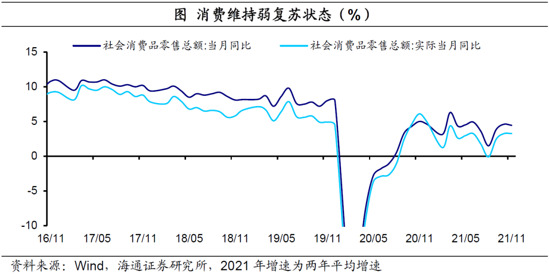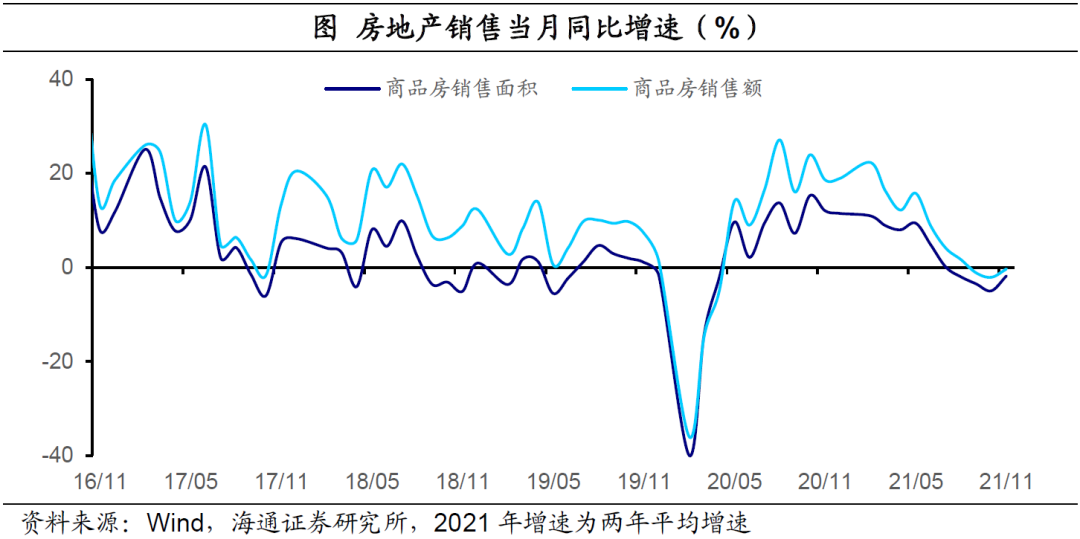 而随着调控政策不断收紧,去年对经济支撑作用较大的房地产市场,回落速度明显加快。10月商品房销售面积当月同比增速-22%,11月回升至-14%;10月房地产投资当月增速降至-5.5%,11月4.8%,剔除原材料价格上涨后的实际投资增速-15%以下。往前看,我们预计房地产政策会继续放松,包括房企和居民融资政策、各地方因城施策政策。但总量的房地产销售和投资或仍然在低位徘徊。