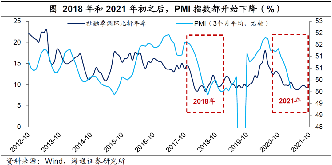 但为何是缩小版的“2018年”呢?这主要是因为政策转向的力度没有2018年那么大,速度也没有2018年那么快。2018年的时候政策收紧速度很快,一个很重要的原因是2017年经济全面恢复、全面向好。而去年以来经济虽然总量恢复,但结构上依然存在薄弱环节,存在“不稳固”、“不均衡”的问题,政策不是急转弯。例如2017年社融的规模有26万亿,而2018年直接降至22万亿;去年社融规模将近35万亿,我们预计今年社融规模可能仍在32万亿附近。