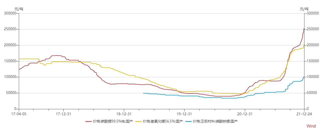 值得注意的是,与股价表现相反,碳酸锂、氢氧化锂、磷酸铁锂等近期价格仍在走强,且进入12月后价格涨势再度扩大。