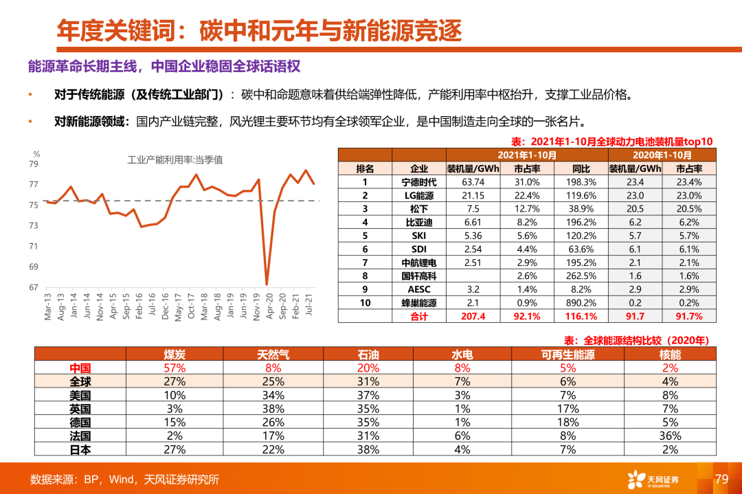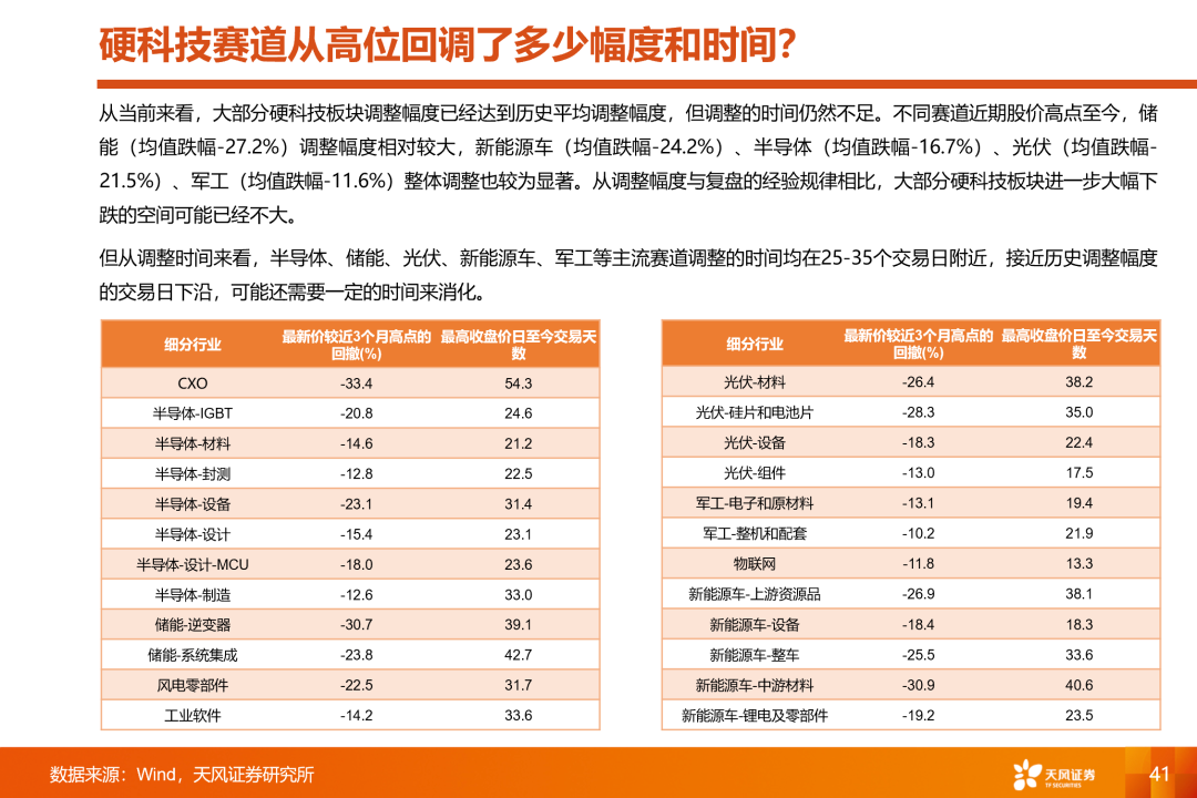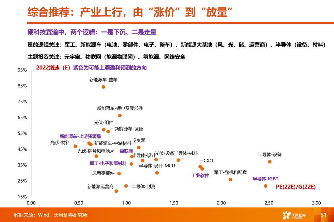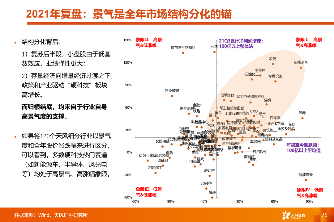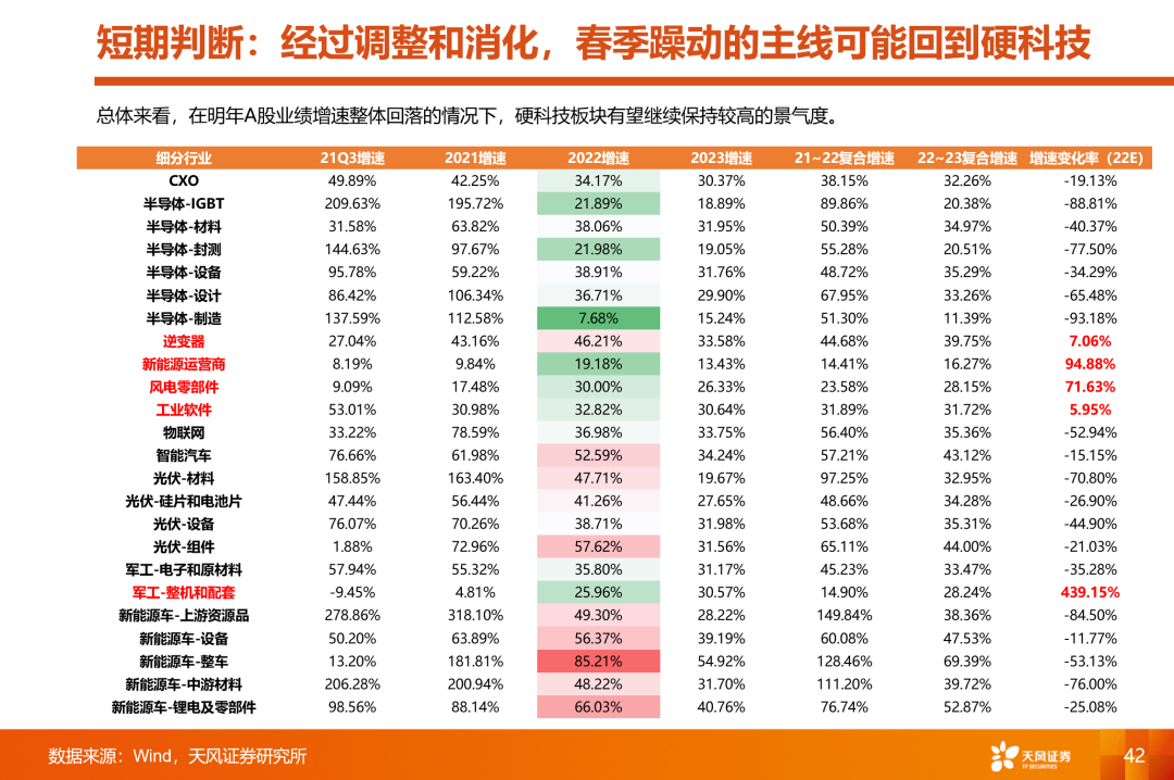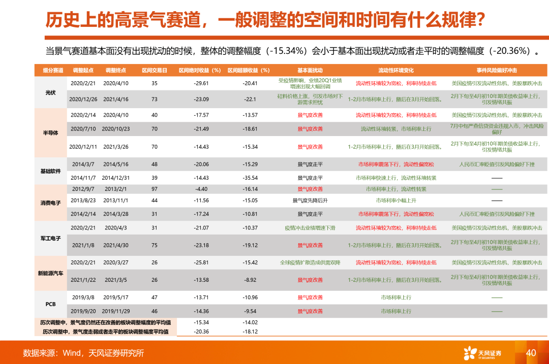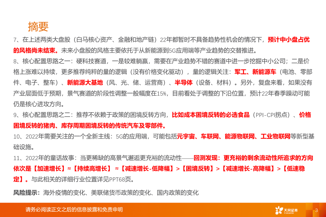 8、核心配置思路之一:硬科技赛道,一是较难躺赢,需要在产业趋势不错的赛道中进一步挖掘中小公司;二是价格上涨难以持续,更多推荐纯粹的量的逻辑(没有价格变化驱动),量的逻辑关注:军工、新能源车(电池、零部件、电子、整车)、新能源大基地(风、光、储、运营商)、半导体(设备、材料)。另外,复盘来看,如果没有产业层面低于预期,景气赛道的阶段性调整一般幅度在15%,目前看处于调整的下沿位置,预计22年春季躁动可能仍是核心进攻方向。