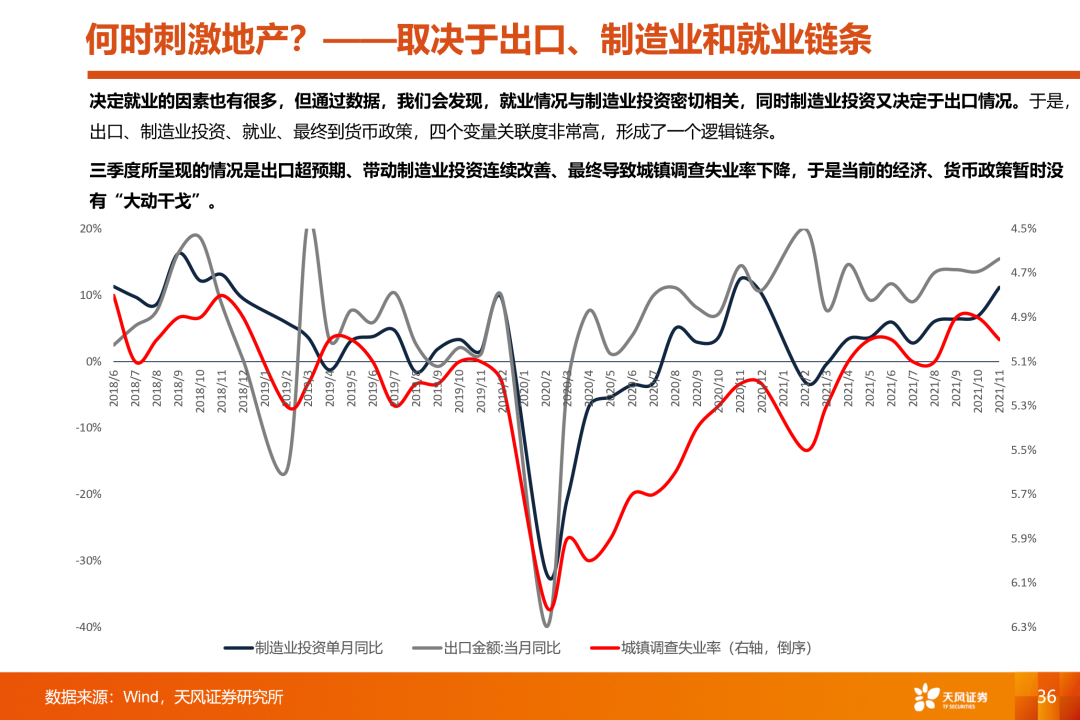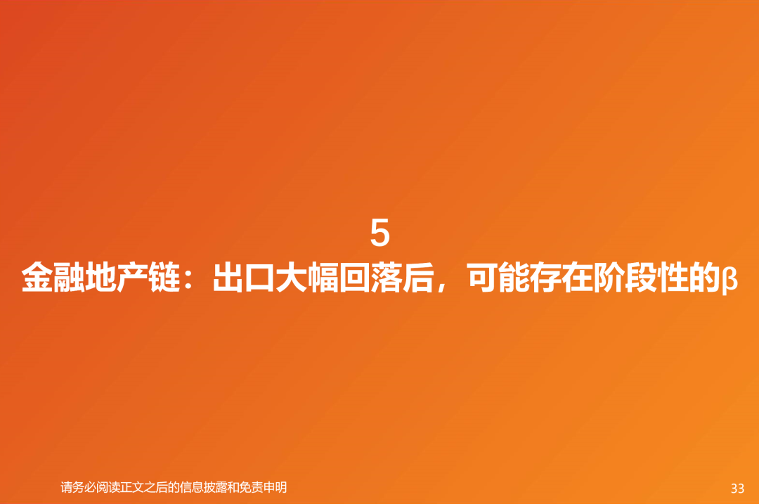 6、金融和地产链的超额收益基本取决于信用扩张的力度,即是否刺激地产。回顾来看,16年提出房住不炒以来,有两波刺激地产,分别是19Q1和20Q2Q3,共同背景是出口、制造业、就业全面下滑之后,逻辑在于大局稳定优先于房住不炒。因此,客观来说,22年出口大幅回落后,金融和地产链可能存在阶段性的β,但是依赖于政策的困境反转不作为我们的主要推荐方向。