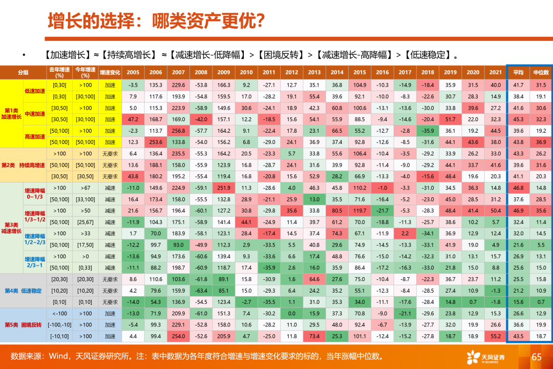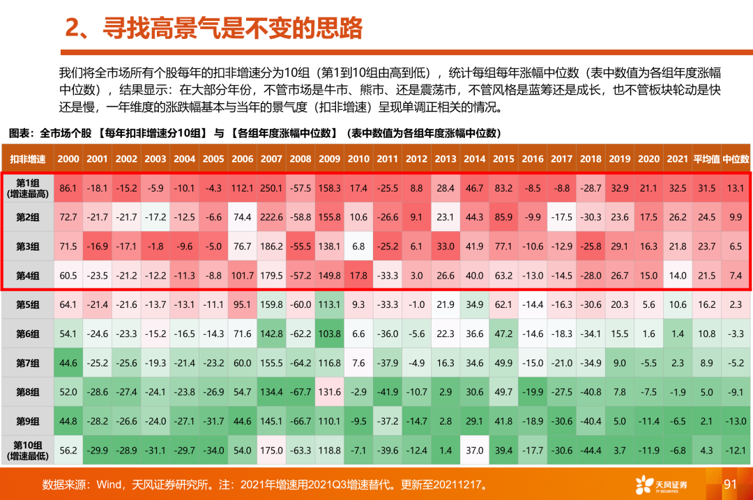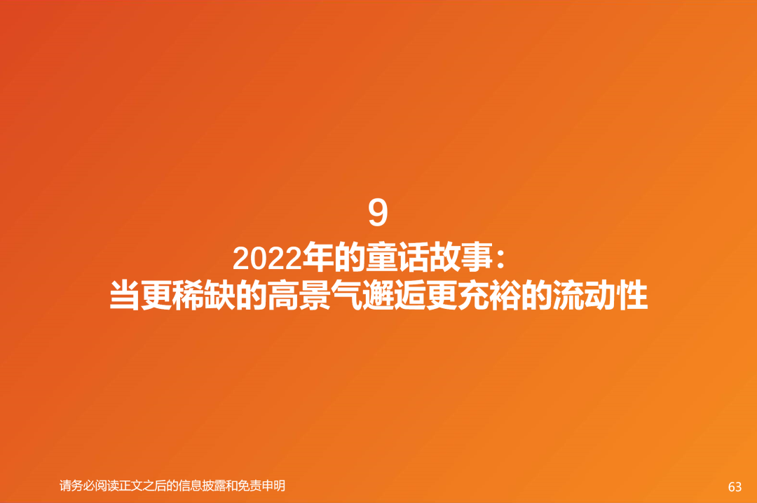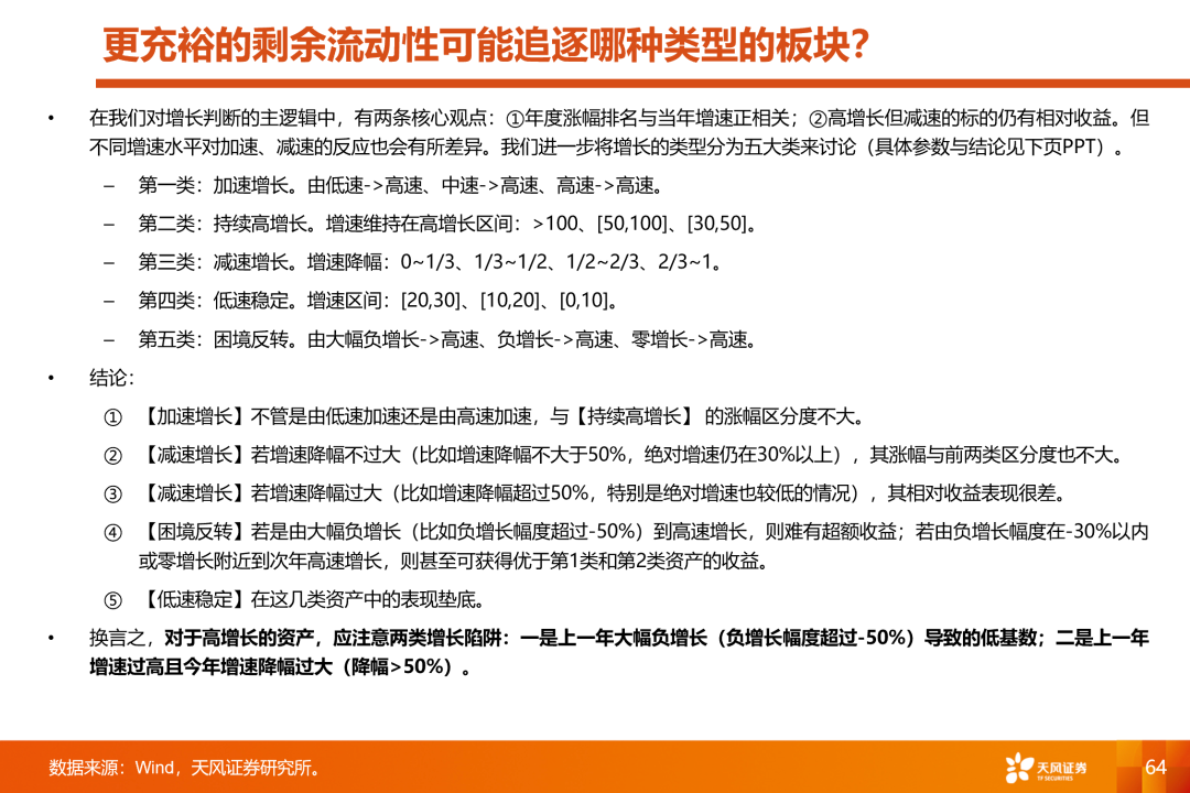 11、2022年的童话故事:当更稀缺的高景气邂逅更充裕的流动性——回测发现:更充裕的剩余流动性所追求的方向依次是【加速增长】≈【持续高增长】 ≈【减速增长-低降幅】>【困境反转】>【减速增长-高降幅】>【低速稳定】。与此相关的详细行业位置详见PPT68页。