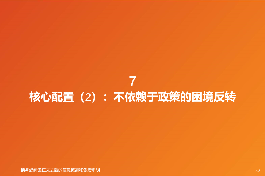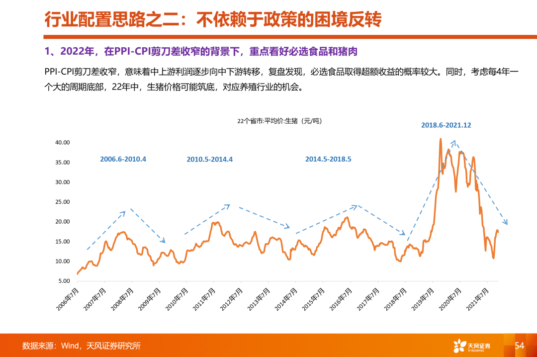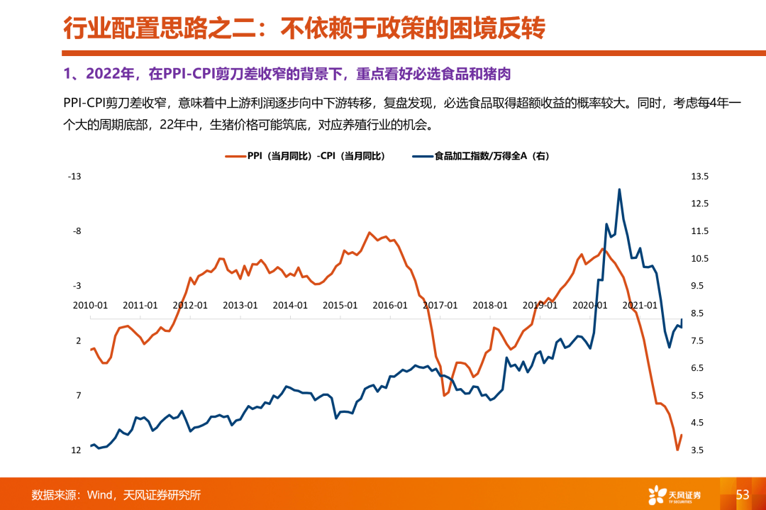 9、核心配置思路之二:推荐不依赖于政策的困境反转方向,比如成本困境反转的必选食品(PPI-CPI拐点)、价格困境反转的猪肉、库存周期困境反转的传统汽车及零部件。