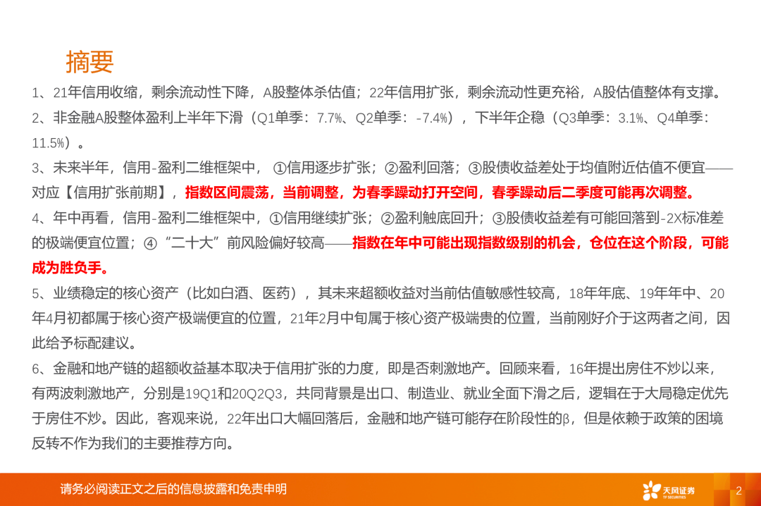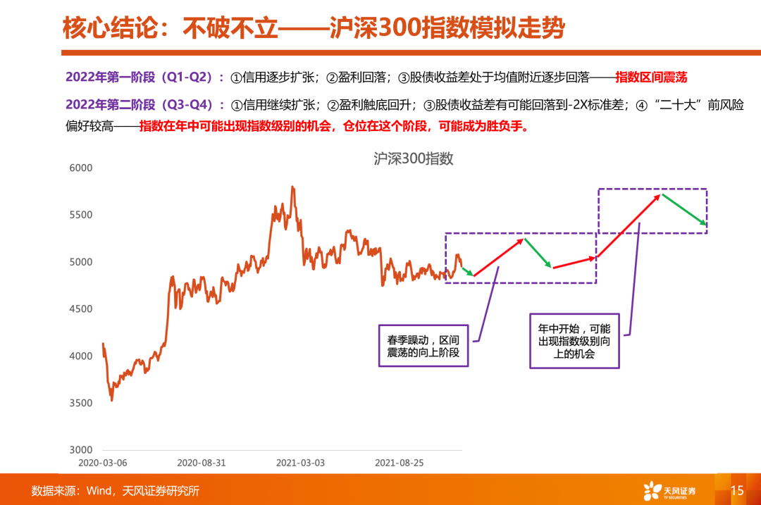 4、年中再看,信用-盈利二维框架中,①信用继续扩张;②盈利触底回升;③股债收益差有可能回落到-2X标准差的极端便宜位置;④“二十大”前风险偏好较高——指数在年中可能出现指数级别的机会,仓位在这个阶段,可能成为胜负手。