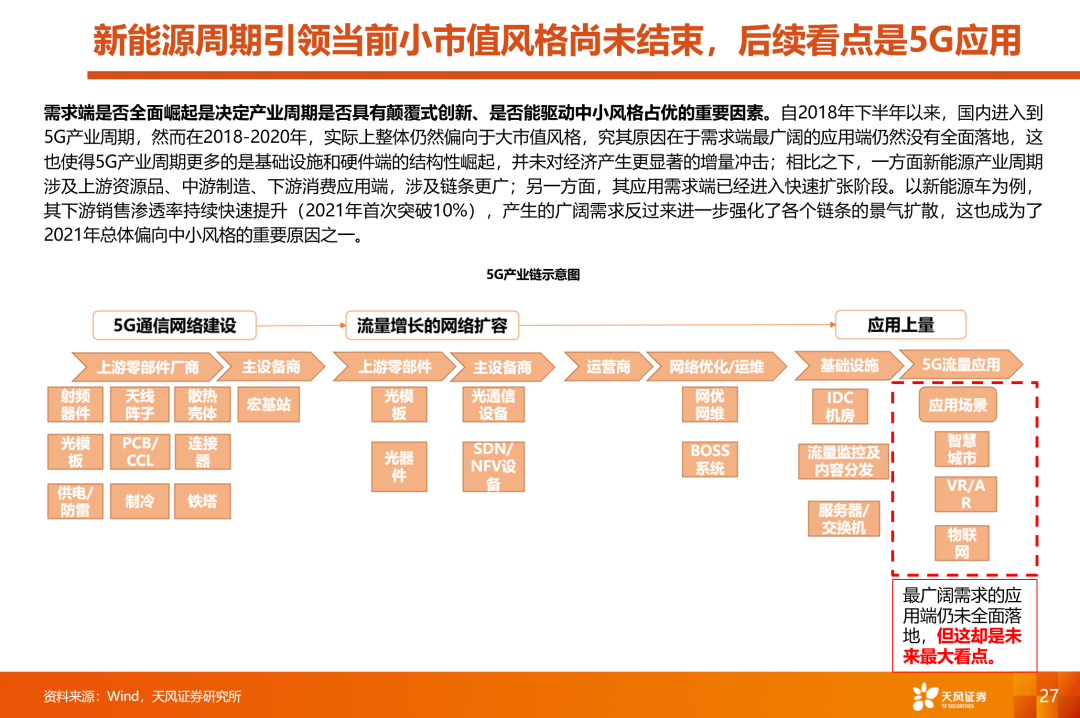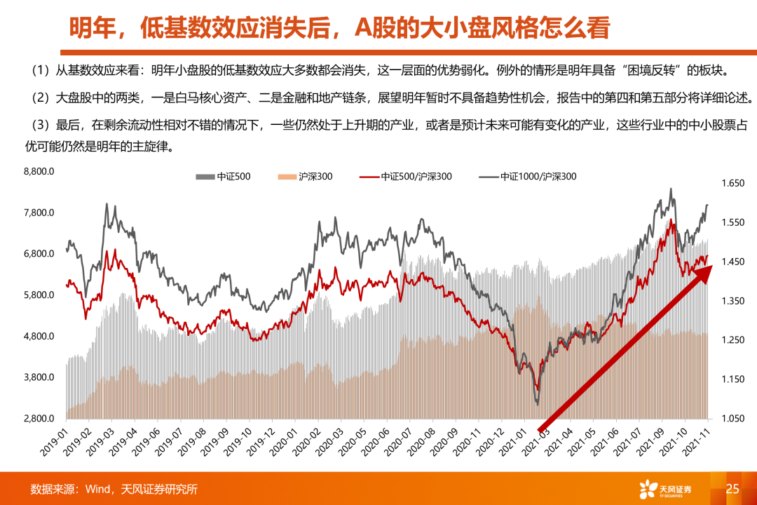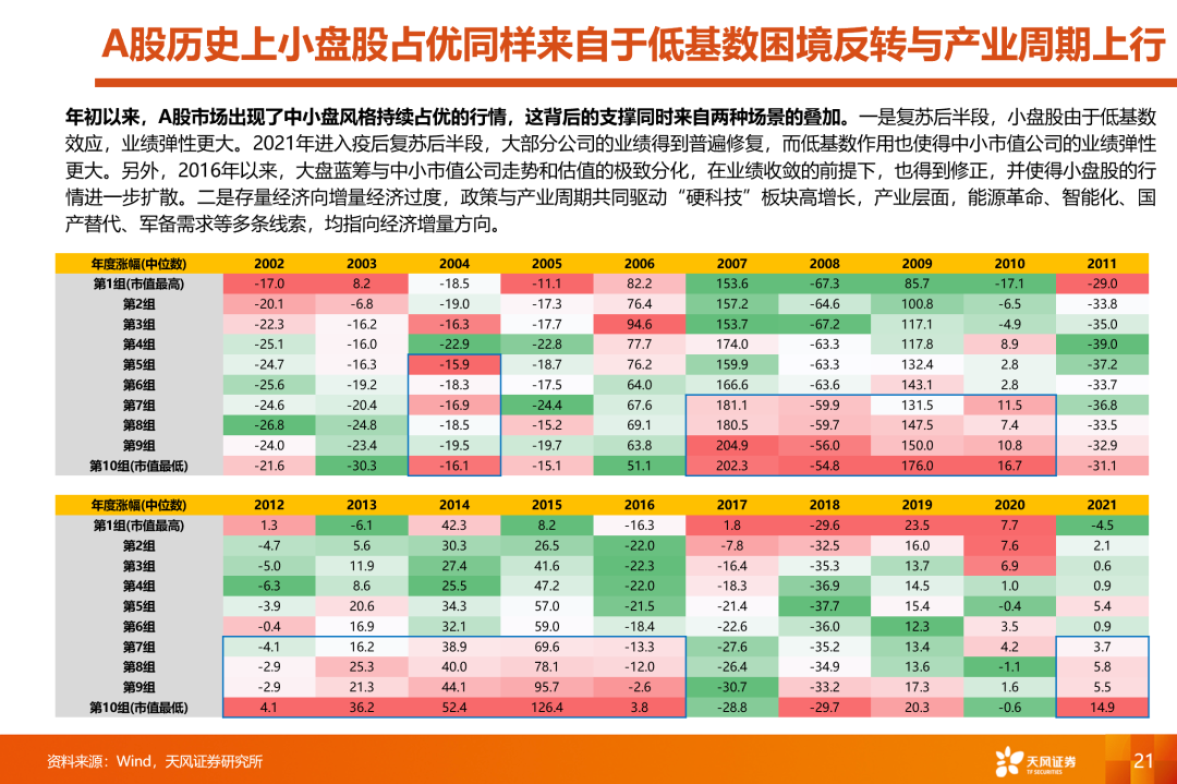 7、在上述两类大盘股(白马核心资产、金融和地产链)22年都暂时不具备趋势性机会的情况下,预计中小盘占优的风格尚未结束。未来小盘股的风格主要依托于从新能源到5G应用端等产业趋势的交替推进。