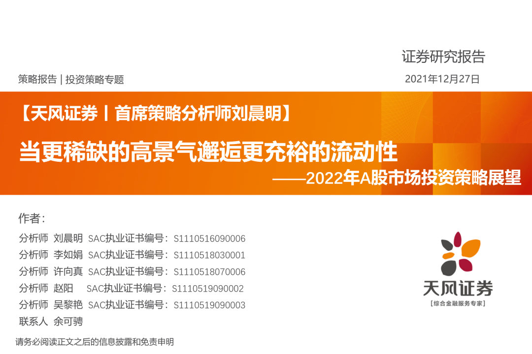 本文作者:天风证券刘晨明、李如娟、许向真、赵阳、吴黎艳、余可骋,来源:天风策略,原文标题:《当更稀缺的高景气邂逅更充裕的流动性【天风策略丨22年度策略】》