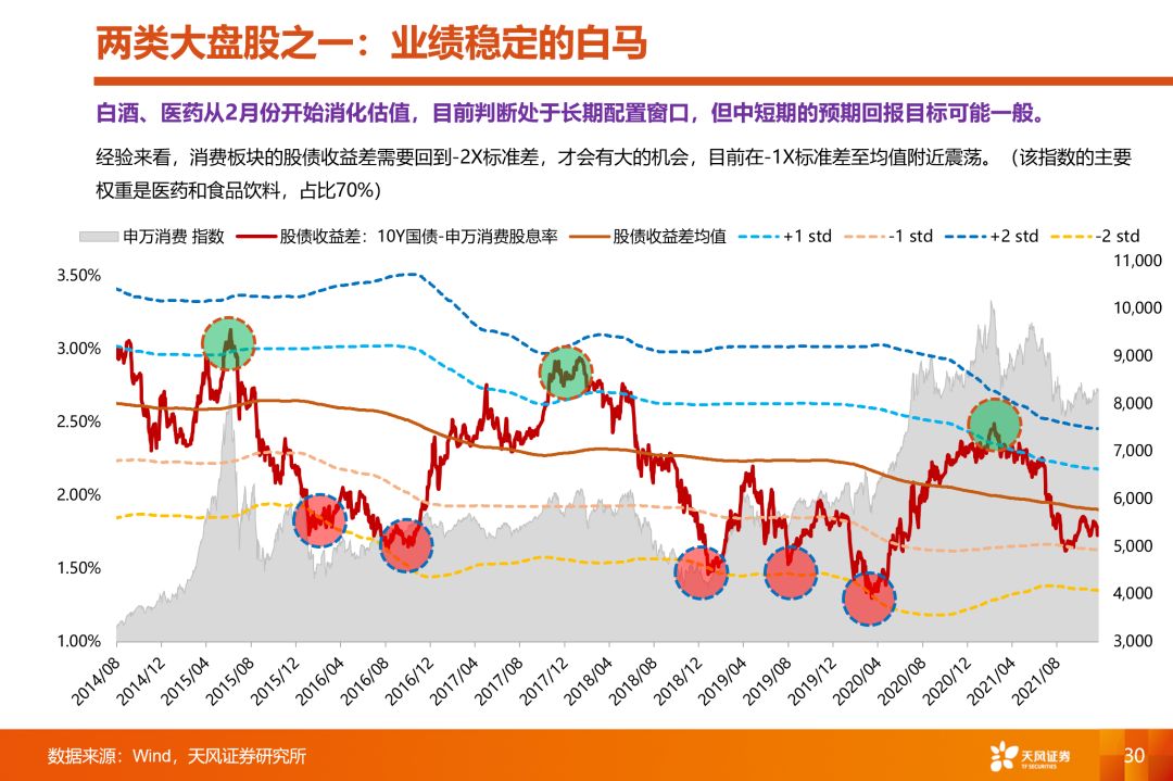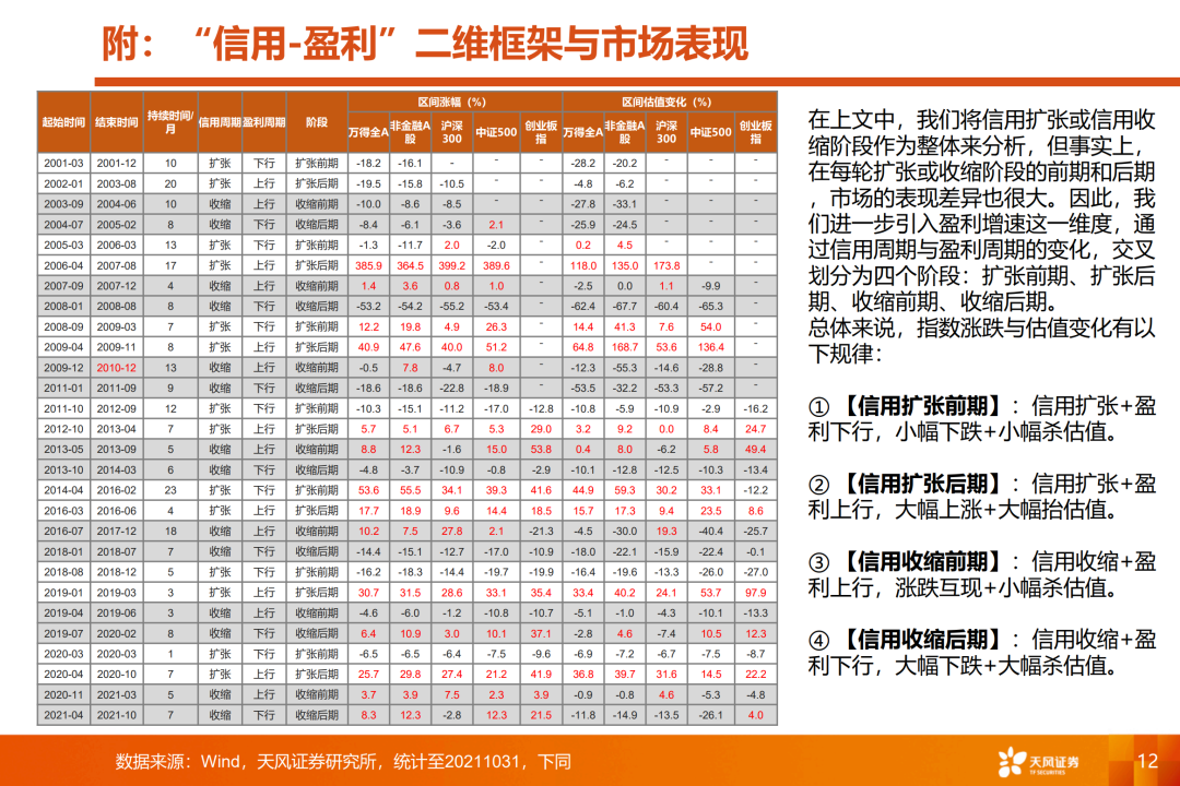 3、未来半年,信用-盈利二维框架中, ①信用逐步扩张;②盈利回落;③股债收益差处于均值附近估值不便宜——对应【信用扩张前期】,指数区间震荡,当前调整,为春季躁动打开空间,春季躁动后二季度可能再次调整。