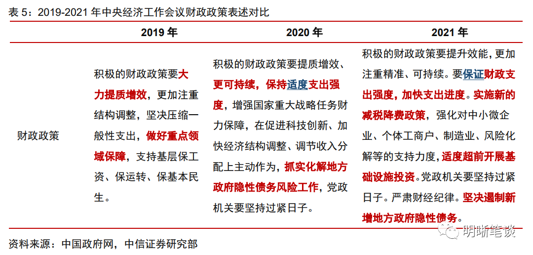 2021年12月召开的中央经济工作会议提出“经济发展面临需求收缩、供给冲击、预期转弱三重压力”,因此在政策定调上,强调“稳字当头、稳中求进”。同时,财政政策定调也明显比去年更加积极,隐含扩张趋势,“适度超前开展基础设施投资”显示了稳增长的迫切性。
