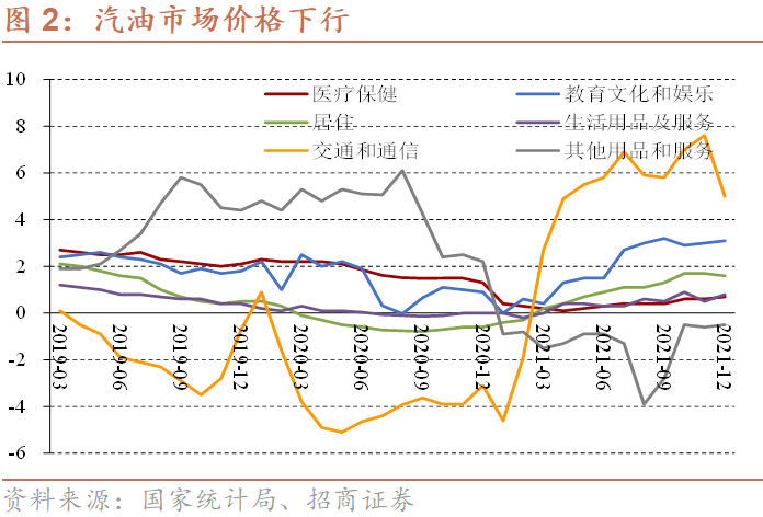 12月CPI同比增1.5%,新涨价因素和翘尾因素的贡献分别为1.5和0.0个百分点(前值分别为1.6和0.7个百分点)。CPI食品类同比降1.2%(前值增1.6%),其中,蔬菜同比增幅收窄至10.6%(前值30.6%),前期的扩大蔬菜生产和南菜北运等保供政策显效,12月重点监测蔬菜价格降8.4%;因节前增加出栏,猪肉同比降幅深化至36.7%(前值32.7%)。CPI非食品类同比增2.1%(前值2.5%),其中交通工具用燃料涨幅收至22.5%(前值35.7%),随着Omicron冲击国际原油价格,12月汽油市场价格回调。